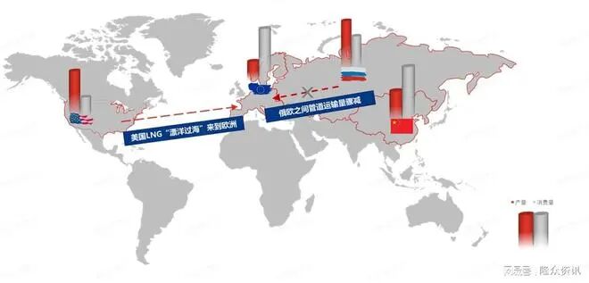 俄罗斯和美国都是主要的天然气生产国,区内天然气产量均远大于消费量,是天然气出口国;中国和欧洲由于先天性的资源禀赋不足,区内的天然气产量难以满足巨大的消费量,属于天然气净进口国。在俄乌冲突之前,欧洲的天然气主要靠俄罗斯进行补充。俄罗斯的天然气通过管道源源不断的输送至欧洲,价格低廉且供应稳定,国际天然气局势整体宽松 ,价格长期低位运行。 俄乌冲突之后,由于俄罗斯向欧洲输气量骤减,欧洲不得不寻找新的气源来源以填补自身巨大的需求缺口,美国成了欧洲的最佳选择。大量的来自美国的LNG通过大西洋源源不断的输送至欧洲,同时,由于缺口较返回列表
