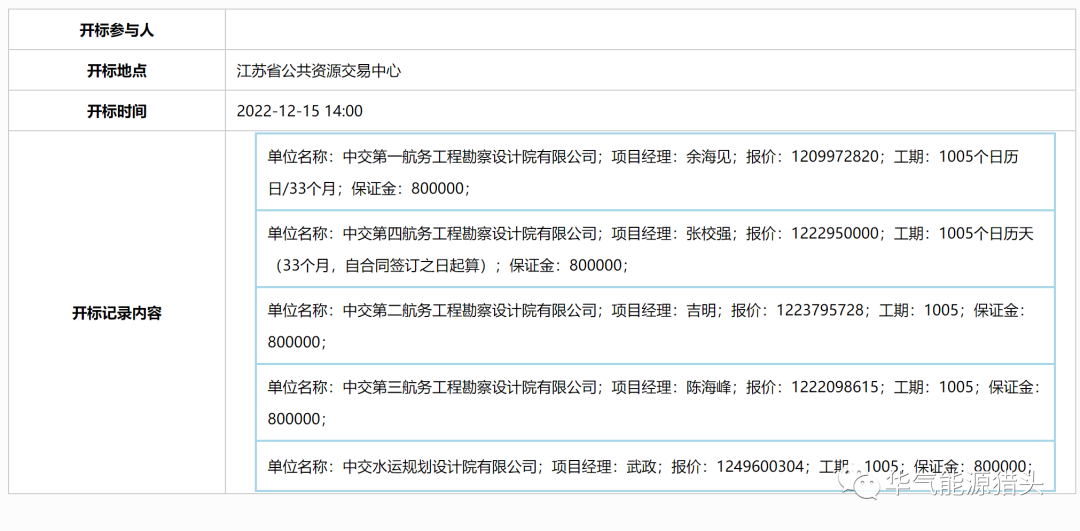 江苏华电赣榆LNG接收站项目共分3个标段:第一标段码头工程(LNGMT-EPC标段)、第二标段接收站工程(LNGJSZ-EPC标段)、第三标段外输管道工程(LNGGX-EPC标段)。* LNGMT-EPC开标记录